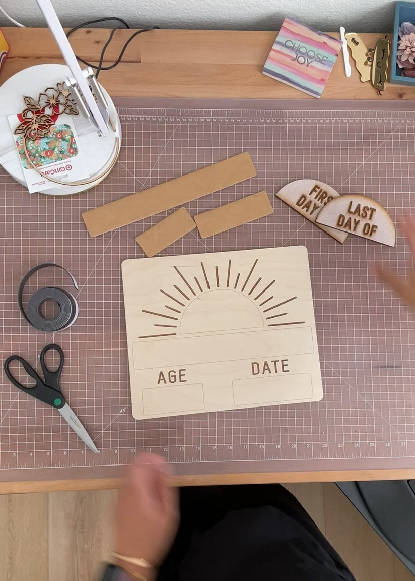Sample photo is engraved on 1/8 inch birch with white acrylic pieces for dry erasable sections. Interchangeable milestone pieces are attached with magnets.