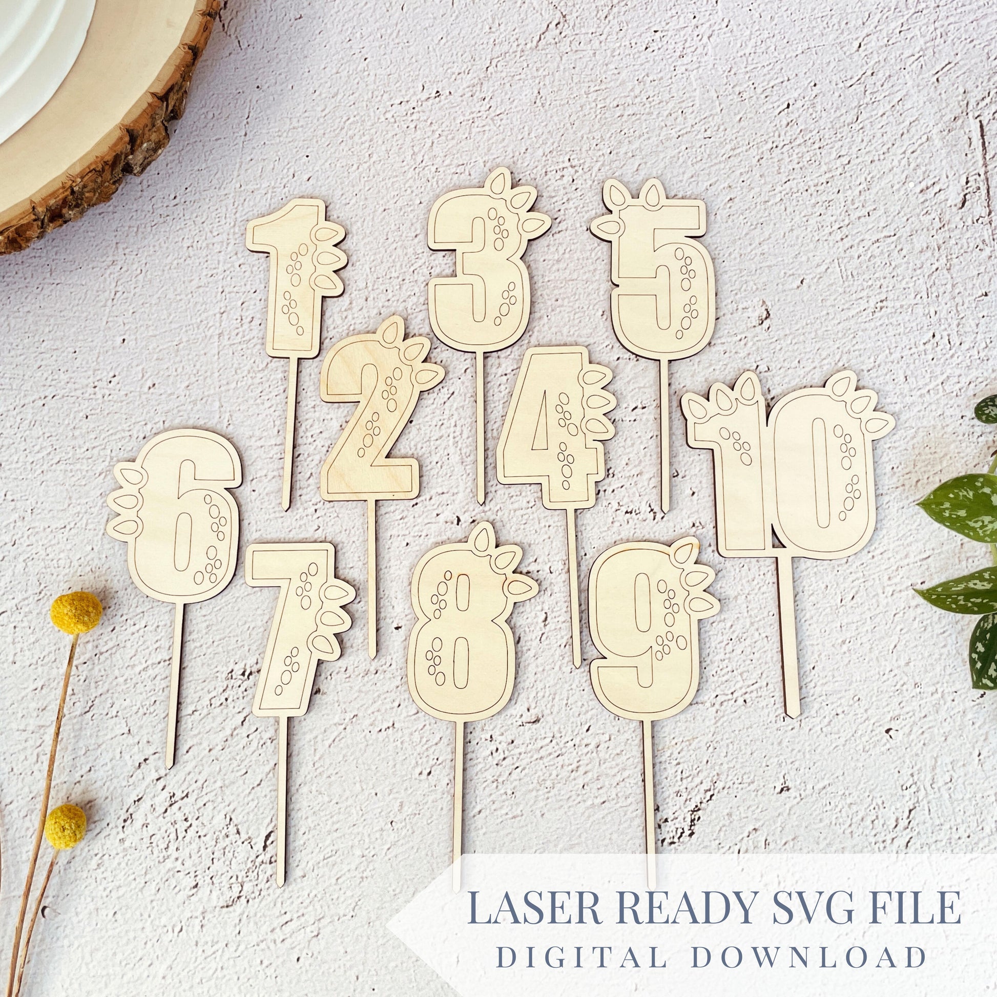 Laser ready SVG file to create these personalize-able dino themed number cake toppers! This set also comes with birthday numbers to fit for birthdays of all ages.