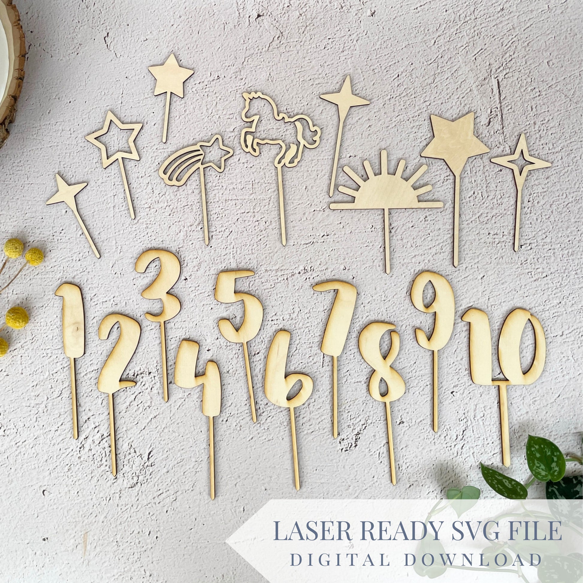 Laser ready SVG file to create these shooting star, unicorn, stars, and sun cake toppers! This set also comes with birthday numbers to fit for birthdays of all ages.